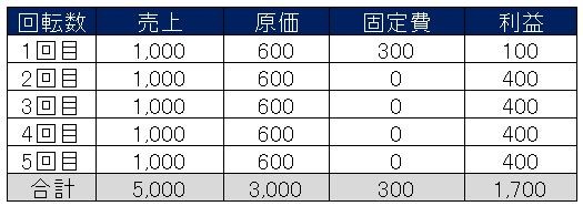 「回転を上げろ」とは大昔から既によく言われていることだが、この図を見ると回転数と利益の関係が容易にわかる。1回転目の売上で固定費を全て回収しているので、2回転目からは粗利がそのまま利益になる。回転数を上げれば上げるほど利益が膨らむことが、この図を見ればよくわかる。